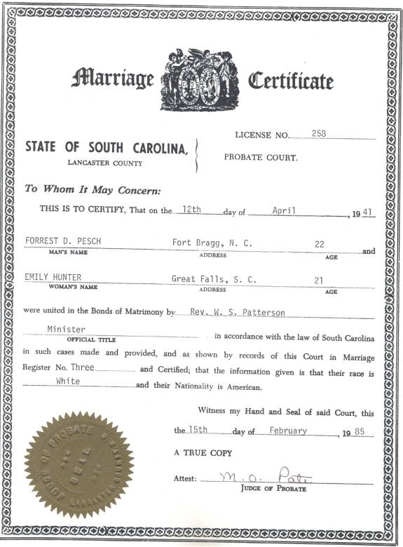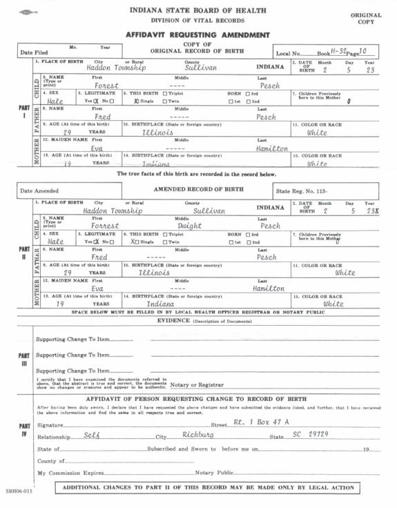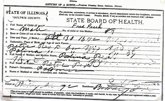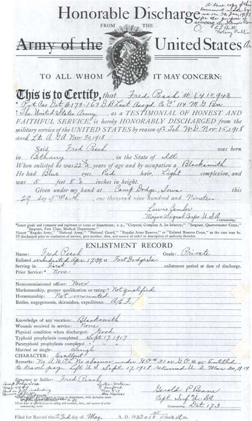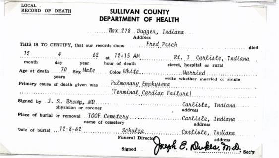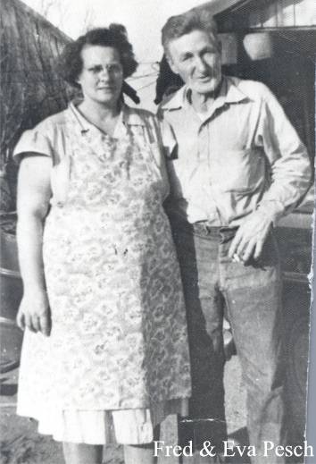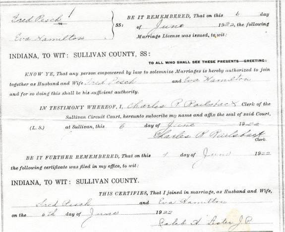 CHAPTER FIVE FRED PESCH----HAROLD PESCH FRED PESCH born 09-30-1892 Bethany, Moultrie, Illinois, died 12-04-1962 Carlisle, Sullivan, Indiana, buried Odd Fellows Cemetery, Carlisle, Sullivan, Indiana, married 06-06-1922 Sullivan, Sullivan, Indiana to EVA HAMILTON born 07-13-1903 Carlisle, Sullivan, Indiana, died 07-20-1997 Oak Village Nursing Home, Oaktown, Knox, Indiana, buried Odd Fellows Cemetery, Carlisle, Sullivan, Indiana. Father: James Melvin Hamilton, Mother Laura Belle Coleman. Fred is the seventh child of Peter and Paulina Pesch. Fred was born and raised on a farm just outside of Bethany, Illinois. He was called “Red” because of his red hair. When he was about thirteen he left home to make his own way. He worked for neighbors around Bethany and later made his way to Indiana to work for his brother in law, Fred Lambright. He eventually went to Iowa. He was around Fort Dodge, Iowa, when WW I began. It was there that he enlisted into the army. He was sent to Camp Cody, New Mexico for his basic training. It was while there that he and some other men were teasing the mules and one of them kicked him in the mouth breaking his two front teeth. He had them capped with gold. Fred went to France just before the war ended and was assigned to Company “C” 114th Machine Gun Battalion. His unit was loaded in 40 & 8 boxcars (that is 40 men or 8 mule capacity), and on their way to the front when the Armistice came. He never saw combat but was gassed once. This had serious effect on his health in later years.