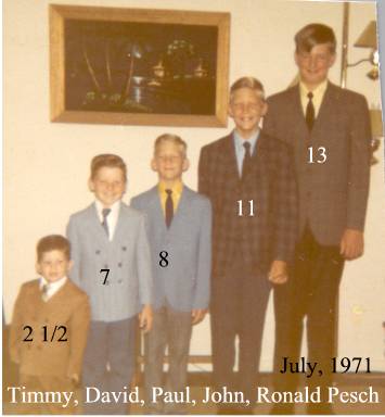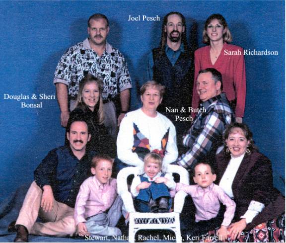 BRITTANY CHRISTINE PESCH born 01-23-1989 California. DAVID EARL HOYLE-PESCH born 07-10-1964 Altus,, Jackson, Oklahoma, married , divorced 1998 to MICHELE LEE STOWELL. David is the adopted child of Harold and the first child of Shirlie Pesch. Laney adopted David in 1965. He works at construction. David and Michele have two children, Christopher and Brent. CHRISTOPHER SCOTT PESCH born 04-16-1987 Oklahoma. BRENT THOMAS PESCH born 12-15-1992 Oklahoma. TIMOTHY WADE PESCH born 01-11-1969 Merced, Merced, California Timothy “Timmy” is the second child of Harold and Shirlie Pesch. He is of the Baptist faith and not married. JOE DALE PESCH born 12-20-1971 Castle AFB, Atwater, California, married 11-04-1994 Frederick, Tillman, Oklahoma to LORI ANN COUCH born 10-07-1971 New Braunsfels, Comal, Texas, Father: Royce Couch, Mother: Mary Russell. Joe “Joey” is the third child of Harold and Shirlie Pesch. Joey is a graduate of Oklahoma University with a degree in radiology. He and Lori are of the Baptist faith and have two children, Lani and Colby. LANI JO PESCH born 11-16-1996 Altus, Jackson, Oklahoma. COLBY LEE PESCH born 08-21-1999 Altus, Jackson, Oklahoma.