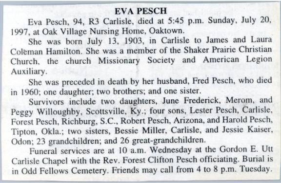 After the War he worked around Bethany for a while and then returned to Carlisle, Indiana to work for Fred Lambright again, as a carpenter. Red also worked in road construction and became a partner in the Adams, Wolf and Pesch Construction Company. They built bridges and County roads in Greene, Vigo, Knox and Sullivan counties, Indiana and in Lincoln and Crawford Counties, Illinois. It was during this time that he met and married Eva Hamilton. Eva did most of the cooking for the road hands for several years. Some times the kitchen was in a tent in the yard of where they lived. At that time the trucks were Model “T” Fords or horse and wagon. Grading equipment was horse drawn. In 1927 Fred and Eva bought a farm and a few years later Fred quit the construction and became a full time farmer. He was a dairyman and truck farmer. He grew watermelons, cantaloupes, tomatoes and sweet corn. His milking herd stayed at 20 milk cows, all milked by hand. He also had hogs and chickens. All machinery was horse drawn. He bought his first tractor in 1940, a Fordson. He didn’t have much money, not with six children to care for, but we always had plenty of food, new clothes at the beginning of school and a warm place to live. As we kids got older if we could get a way to get into town we would get enough money to see a movie and get popcorn. A lot more than some of the other kids we grew up with in our community. Red was known for his honesty and dependability. He was always willing to help any who needed it. He would let people have a cow to milk, so they would have milk for their family. He would let some keep the extra automobile as long as they needed it. He would share the meat at butchering time. When his sweet corn was ready for market he would not sell any until all the neighbors had a “mess of corn”. His opinions were highly respected in the community. Though he was asked several times to seek public office in the County he would always decline with some of his “words of wisdom”. Like, if a politician isn’t a crook before he goes into office, he will be before he gets out and I’m not a crook now and don’t intend to become one. Red had a few other philosophy sayings that still make sense today. When he was having a discussion with some one and didn’t agree with them, he would always say, “I’m just like you, only different”. When asked why he had changed his mind about something, it was “a wise man will change his mind but a fool never does”. When you questioned him about some decision he had made he would tell you “I might not always be right, but I’m never known to be wrong”. One he used in business deals was “figures won’t lie but liars will figure”. These are just a few but it seems that he always had an answer that you really could not argue with. In the days of his youth, Red loved to ice skate in the wintertime. There was a creek just behind the house that would freeze over and he could spend his whole day on it. He has told many time of the day while skating he caught the toe of one of his skates under a piece of barbed wire that had frozen in the ice and fell. He didn’t know how long he lay there but when he woke up it was dark and he heard his sister, Golda calling for him. Nothing was broken but he said he sure had a headache. After suffering for several years with Pulmonary Emphysemas, which was aggravated from being gassed in WW I, Fred died at his home near Carlisle, Indiana, of Terminal Cardiac Failure. He was buried with military honors. His four sons were all serving in the military at the time, one in California, one in France, and two in Germany, were able to come home at this time. In 1987 Eva Hamilton Pesch decided that she would write an account of her life and send a copy to each of her children, that they might have a record of part of history of the community in which they grew up. Many of the homes, farms, school buildings and community names are gone now. I was born two miles south of Carlisle, Indiana, on July 13, 1903. We lived on what was known as the C.T. Atkins farm. My parents are James Melvin Hamilton and Laura Belle Coleman Hamilton. I grew up with two brothers and three sisters, King, Wayne, India Hamilton Meeks, Jessie Hamilton Kaiser and Bessie Hamilton Miller. The first thing I remember is Dad leaving me in the buggy alone while he led the horse through the gate and closing it. The next was some cousins catching some birds in a shed. I was told they were guineas. We moved from there to a farm north of Carlisle and all I remember there, is a girl named Rose and a big turkey gobbler with a big tail. We next moved to the Bond farm, south of Carlisle. There were two houses on the farm and we lived in both before leaving there, moving to the Harriet Brown farm. I had started school by this time at the Cocklebur School. The community where we lived was called “Browns Ridge”. There were several neighbor kids close enough to run in and out and to play with. We played jump rope, hide and seek, dare base, kick the can, and town ball. In the winter when it snowed we played fox and goose. In March of 1913 we had a flood and it covered the whole river bottoms except seven acres where the houses and barns stood. Seventeen people came out of the flood and stayed there. The men slept in the barns and the women and children slept in the houses. We moved in the fall to the Lafe Boone farm. There was a cement tile factory on the farm and Dad worked there as well as helping with the farm work. I entered school at the Shepard School in “Shaker Prairie Community”. There were only a few kids close enough to try to get any games going. We lived there two years. We moved to the Peyton Tucker house. The community was known as “Tucker Town”. I went to the Climax School for one year. When school was out that year we moved to what is now known as the Squires place. It is in the same community where I first stared to school, the Cockl