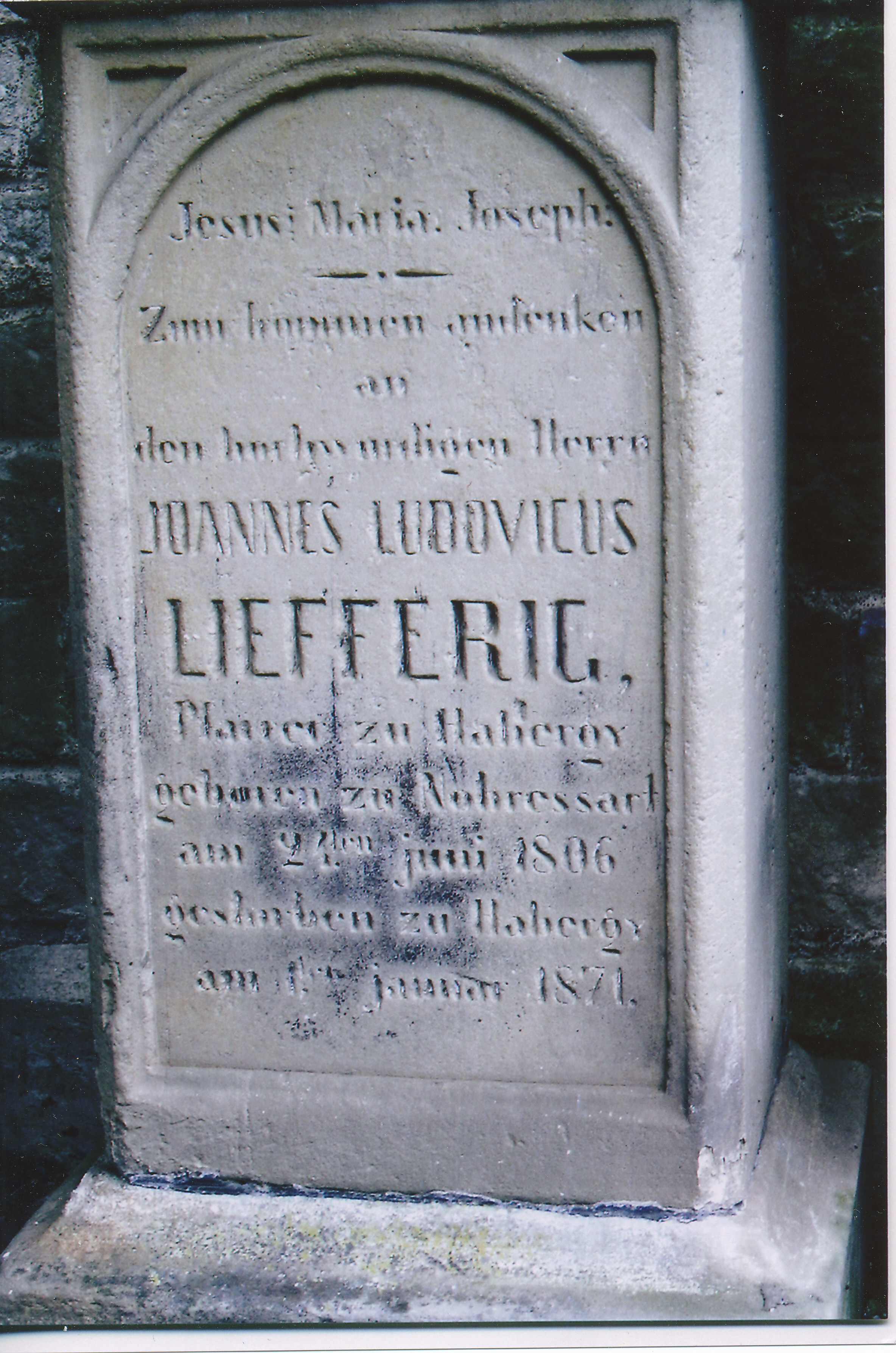 (3) RIGHT NEXT TO THE CHURCH ENTRANCE IS A TOMBSTONE WRITTEN IN GERMAN. THIS PROVES THAT GERMAN WAS SPOKEN IN HABERGY WHEN MATHIAS AND HENRY LIVED THERE. ENGLISH TRANSLATION: FOR THE DEVOUT MEMORY OF THE REVEREND JOANNES LUDOVICUS LIEFFERIT, PASTOR IN HABERGY. BORN IN NOHRESSART JUNE 24TH 1806, DIED IN HABERGY JANUARY 1871. YOU CAN FAINTLY RECONIZE A SWASTIKA IN DARK PAINT THAT WAS REMOVED. IT WAS PROBABLY PUT ON THE STONE AS AN INSULT DURING WWII BECAUSE IS HAS GERMAN WRITING.
