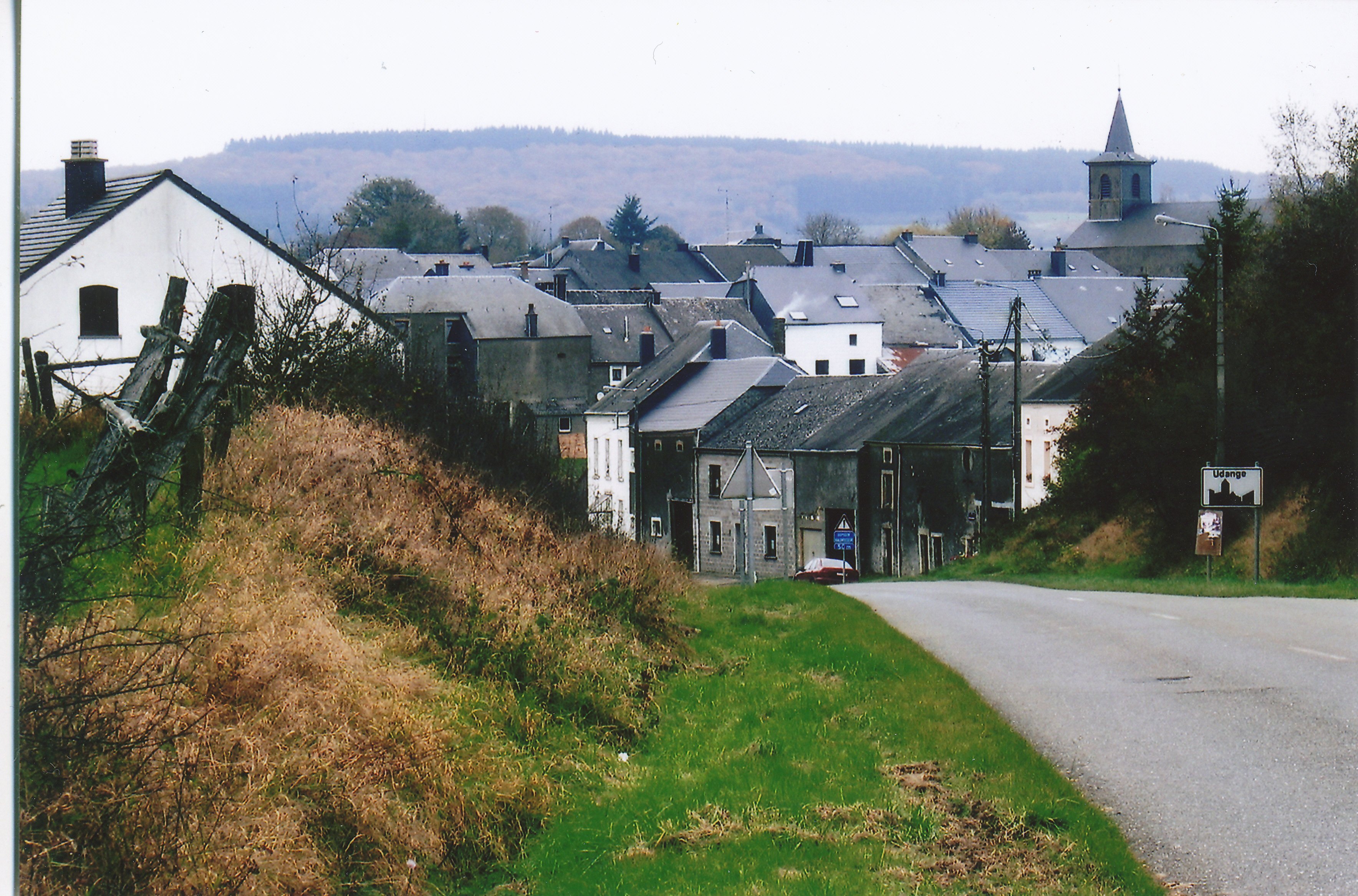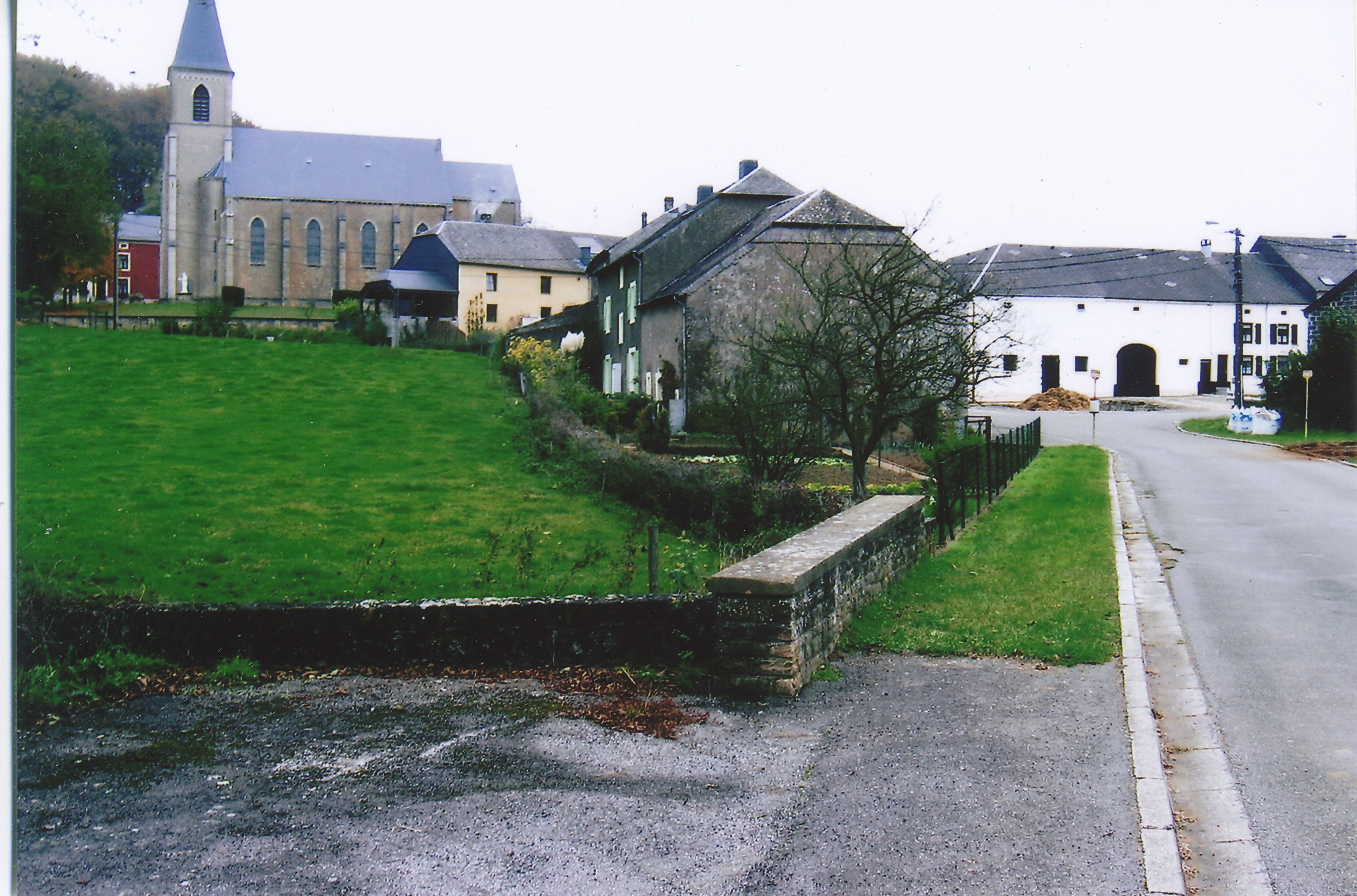 (5) VIEW OF THE VILLAGE WITH A MANURE PILE IN FRONT OF THE WHITE FARM. THESE PILES WERE STILL COMMON IN THE EIFLE VILLAGES OF GERMANY DURING THE 1950'S, BUT DISAPPEARED SOON AFTER THAT. EVIDENTLY THEY ARE STILL COMMON IN THIS AREA OF BELGIUM.